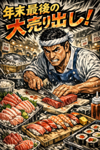 明日は9時〜15時まで店頭にて営業!!!! 最後の大売り出し!!!! 注文分の寿司、刺身、ブリの引き渡し🐟 店の外で凍えながら店頭売り出しもします!!! 皆様のお越しをお待ちしております!!!!